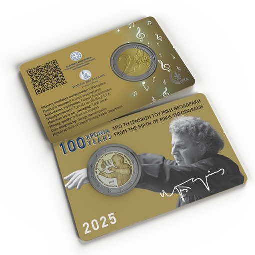 Η επίσημη αυτή coin card εκδίδεται για τα 100 χρόνια από τη γέννηση του Μίκη Θεοδωράκη (1925–2021), ενός από τους σημαντικότερους Έλληνες συνθέτες, με παγκόσμια αναγνώριση και τεράστια προσφορά στη μουσική και τον πολιτισμό. Η κάρτα παρουσιάζει το νόμισμα ενσωματωμένο σε ειδική σκληρή κάψουλα, προσφέροντας υψηλή προστασία και άψογη παρουσίαση.